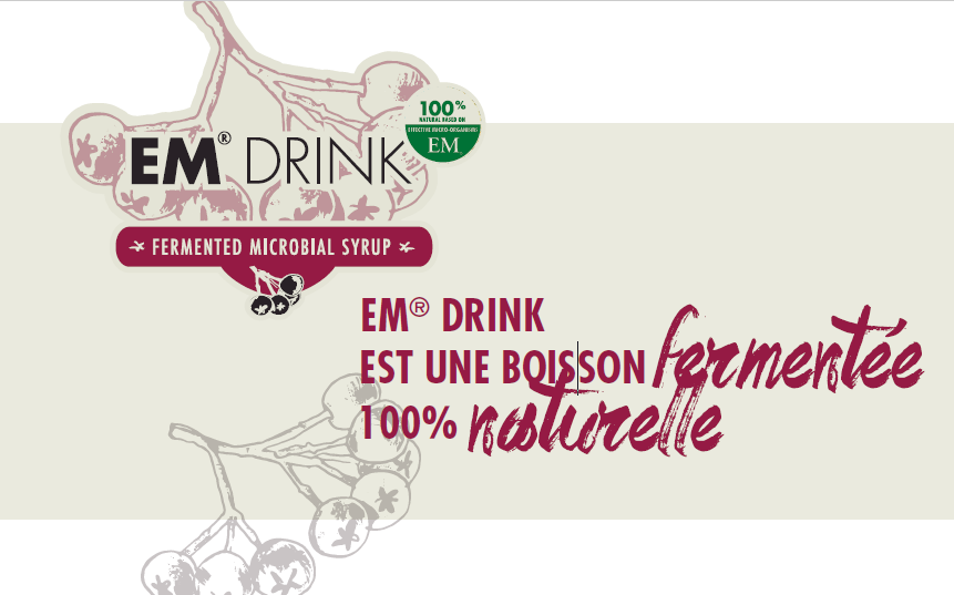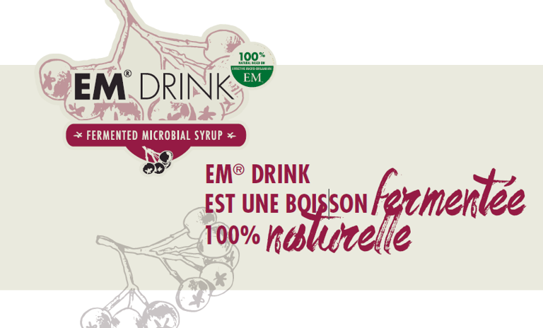 L'EM® Drink est une boisson probiotique naturellement fermentée, fabriquée à partir de baies d'aronia cultivées avec la technologie des EM®. L'idée du cycle circulaire est soutenue en utilisant le système de Bokashi et les micro-organismes efficaces (EM®).